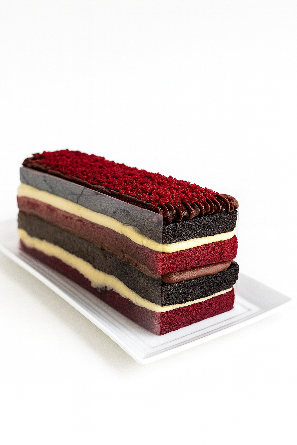 Moody meets magical. This layered beauty brings together deep chocolate sponge, red velvet layers, cream cheese filling, and a thick coat of fudge frosting. Topped with red velvet crumb for drama.