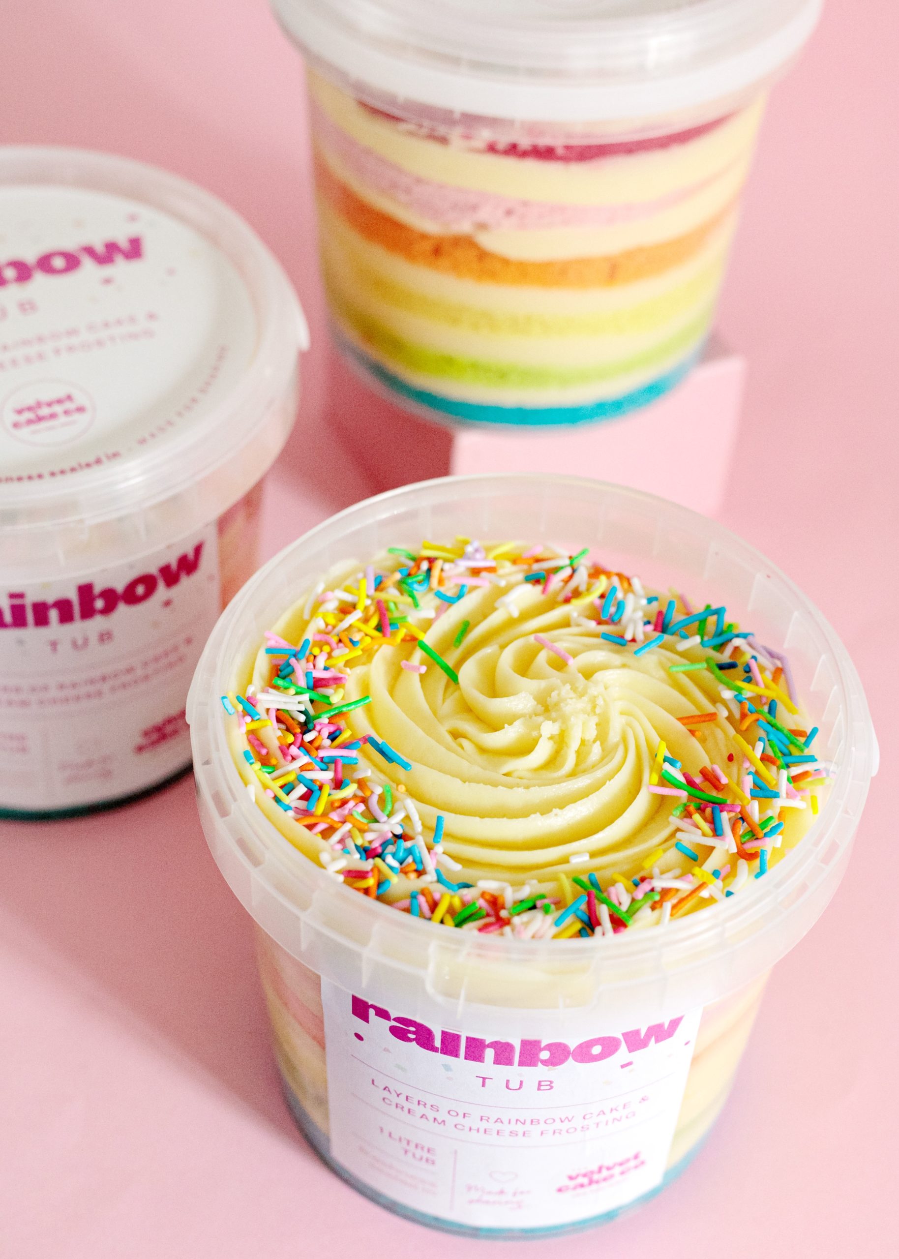 Indulge in our Cake in a Tub, featuring layers of moist Rainbow Buttermilk Cake piped with creamy cream cheese frosting.